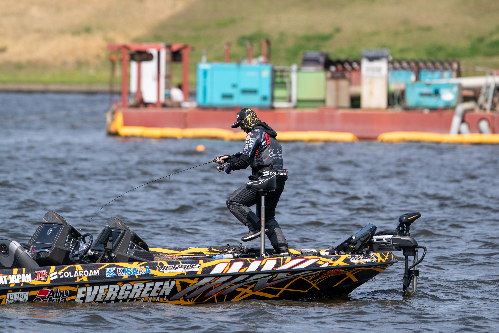 ボートに向かってくるバスの走りに追いつけず、テンションを緩めまいとボート上を後ろまで走ったが間に合わず、一瞬の緩んだ隙を突いてジャンプされてしまった。