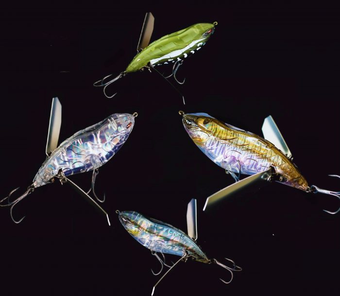 一番上が背中面だけが蓄光樹脂でできた腹黒の夜光アマガエル。早朝や日没後のローライトでも人間に見やすく、バスには黒に見えます。