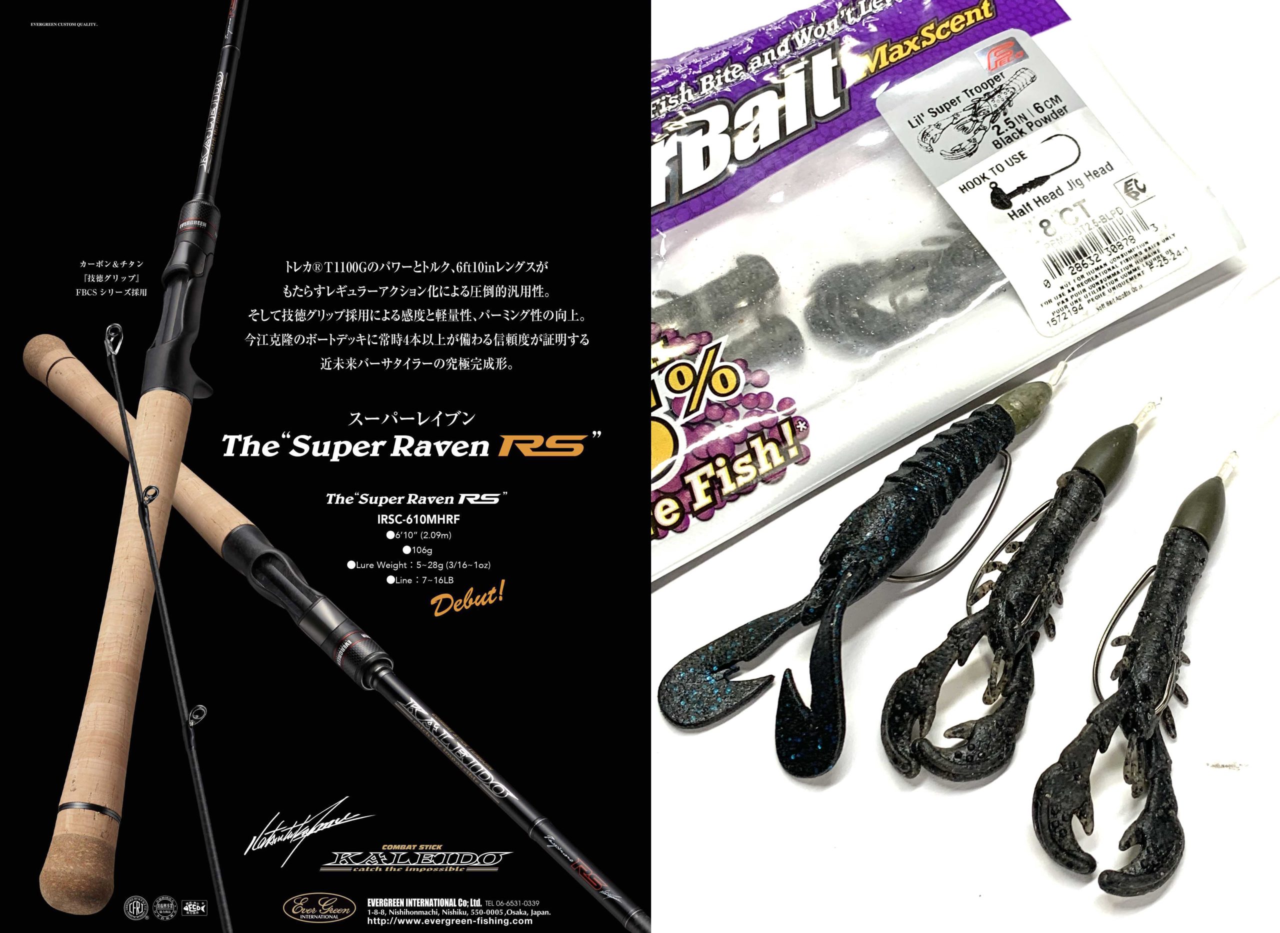 ロッドは毎回最低4本以上常にデッキに積んでる「スーパーレイブン」、リールはグラビアスの「ブラックレイブンREVIVE」、それに「真っ黒のトゥルーパー2.5inch」のリアクションテキサスって、まさに「黒鴉コンビ」です。