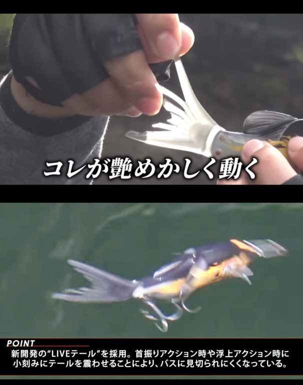 この動画で実感して欲しいのは、カバーを全然気にせずカバーフルコンタクト後の首振りでビッグバスがモンドリングするシーンと、もう一つは今回から新開発テールとして搭載された「LIVEテール」の実に生き物ライクな動き。