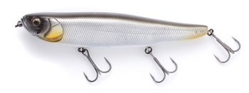 着水からボート際までの連続高速ドッグウォークでは金属サウンドとスプラッシュがバスに水面に追われたハスや鮎を演出、強烈なアピール力でリアクションを誘います。また、ポーズ&ゴーで移動距離を抑え、時間を掛けたスロースケーティングでは、僅かな動きにラトルチェンバーが敏感に反応、涼しげで明確なサウンドでバスをミドルレンジからでも浮かせて喰わせることのできるビッグペンシルベイトです。