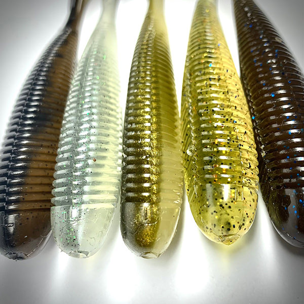 モグラスイムジグを使用したスイミングジグに最適な超デッドスローリトリーブ対応、ウォブらないパーフェクトロールアクション仕様の特殊シャッドテールワーム、それがスラッシュバンビです。
